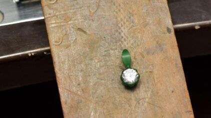 - 2. 石座の作成と石合わせ:専用の工具を使って石がぴったり収まるよう微調整し、光を取り込んで石を輝かせるための貫通穴をあけます。