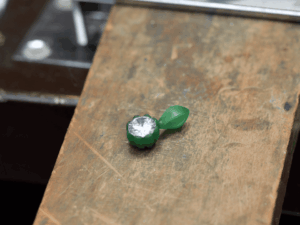 - ポイント:石が外れないよう、そして光をしっかり取り込んで美しく輝くよう、慎重に貫通穴を開けます。