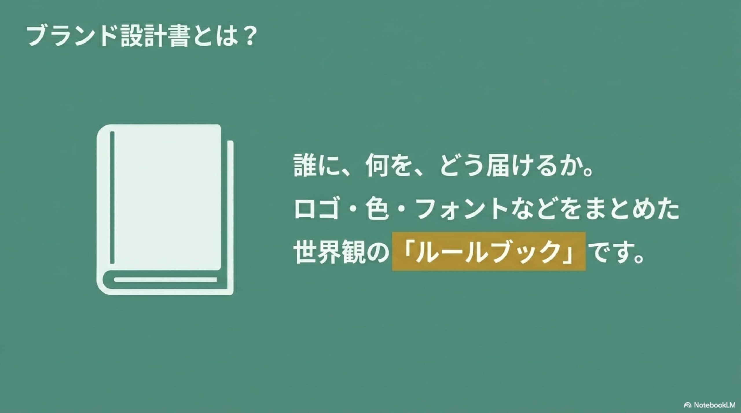 ブランド設計書では、ブランド名やロゴマーク、色、フォント、トンマナなど、ブランドに必要な要素をまとめます。
