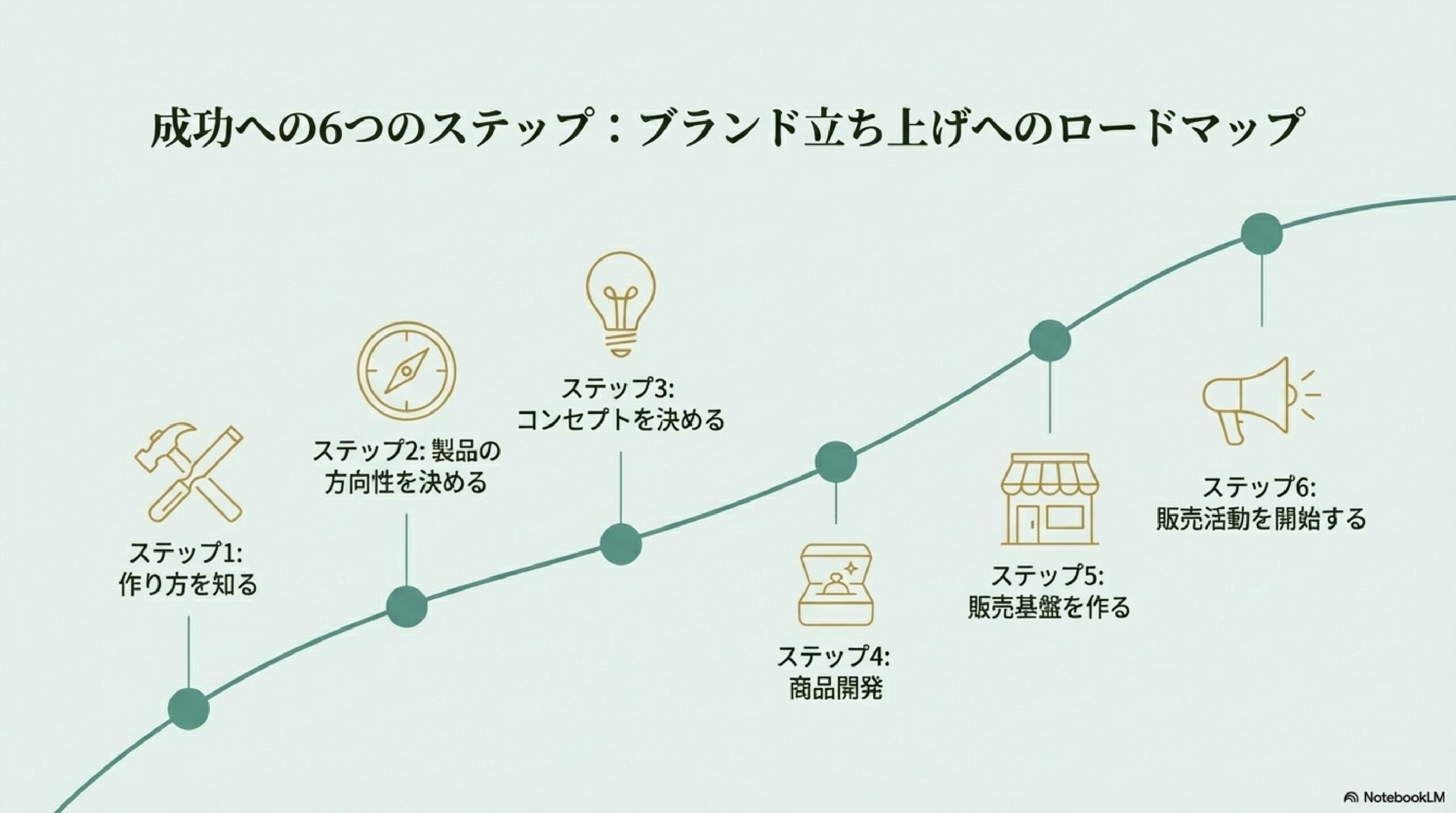 ブランド立ち上げに必要なプロセスの全体像を6つのステップで体系的に解説します。