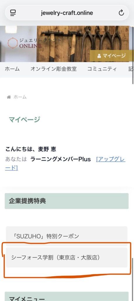 ログイン後、マイページに入っていただきますと、中程に提携企業特典というセクションがあります。